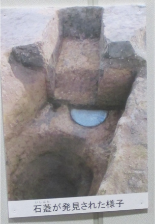 蓋の上の土色に濃淡あり、濃い部分が盗掘痕跡、蓋との間の淡い部分を盗掘者が掘り進んでいたら、今回の発見はなかった。